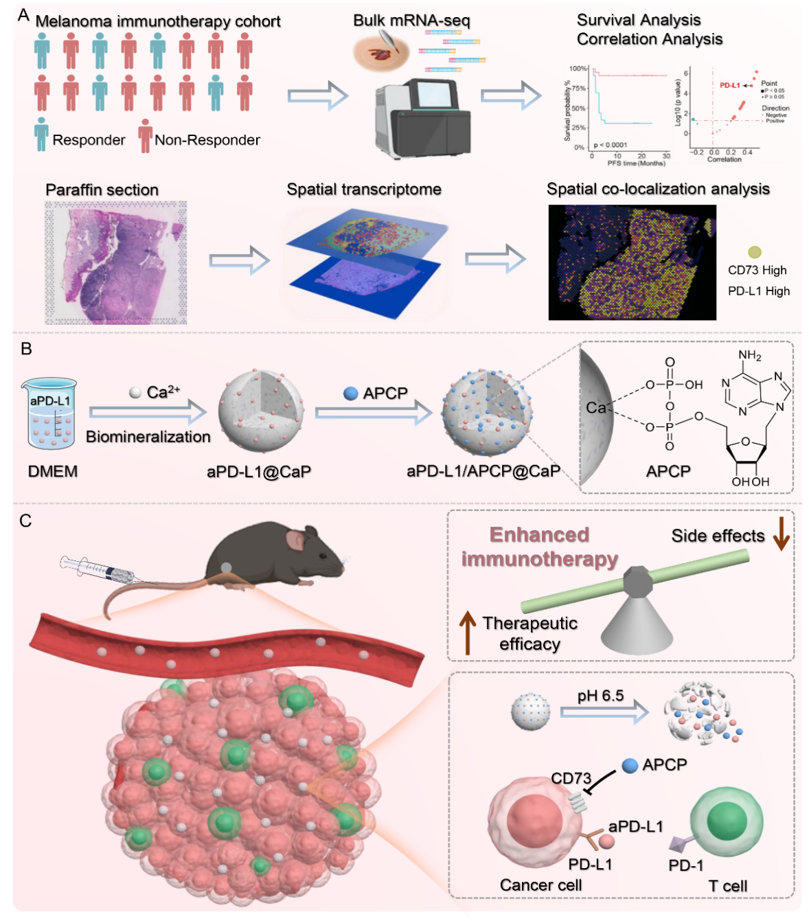近期,91成人 周文虎教授团队与91成人 湘雅医院陈翔教授团队联合在国际知名期刊《Advanced Science》(IF=14.3)上发表了题为“Co-Delivery of aPD-L1 and CD73 Inhibitor Using Calciu…
