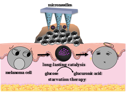 丁劲松-周文虎教授团队在诊疗研究综合期刊《Theranostics》(IF=11.556)上发表了题为“Cell membrane inspired nano-shell enabling long-acting Glucose Oxidase for Melanoma starvation therapy via microneedles-based percutaneous delivery”的最新研究成果。该研究构建了一种可实现长时间维持葡萄糖氧化酶活性微纳米囊,并将该纳米结构装载于可溶微针中,通过局部经皮精准给药,实现皮肤肿瘤的长效饥饿治疗。