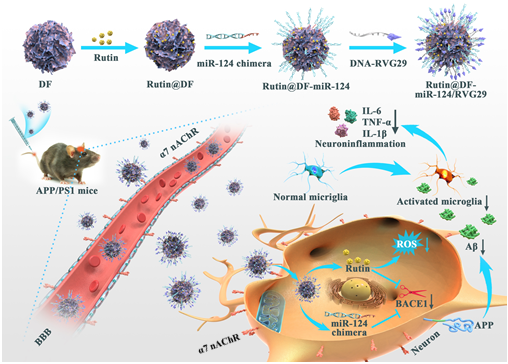 阿尔茨海默病(Alzheimer's disease ,AD)是一种不可逆性的神经退行性疾病,是威胁老年人健康的主要病症,临床表现为认知性功能障碍。其发病隐匿,病程较长,目前还没有有效的治疗方法。MicroRNA-124 (miR-124)是正常脑组织中含量最丰富的miRNA,具有改善AD样病理症状的巨大潜能,而在AD患者脑组织中显著降低。本研究团队基于滚环扩增反应开发了一种DNA纳米花(DNA nanoflowers, DFs)递送系统,以实现外源补充miR-124用于AD治疗。制备得到的DFs尺寸可控,形态均匀,并通过简单的杂交过程附着miR-124嵌合体。此外,DFs进一步被RVG29肽修饰,实现透过脑血屏障(BBB)和神经元靶向蓄积的双重功能。同时,一种小分子辅助药物芦丁通过π-π堆积作用嵌入到DFs结构中。研究发现,miR-124和芦丁协同抑制BACE1和APP的表达,从而减少了Αβ淀粉样斑块的生成。尾静脉注射给药后,RDMR纳米粒可明显上调APP/PS1小鼠海马中miR-124水平,改善长时程增强作用,减少海马Aβ斑块数量,抑制神经炎症,获得了较好的治疗效果。