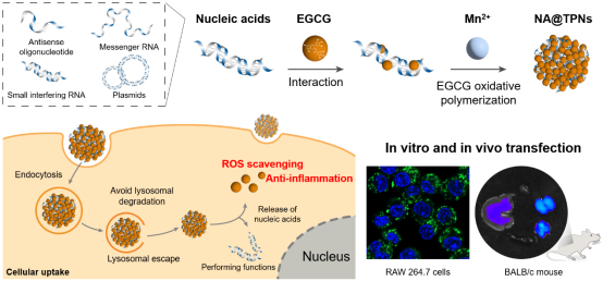 的周文虎教授和广东医科大学湛江中心医院的齐妍教授团队合作,在中科院1区TOP期刊 Advanced science (IF=17.521)上发表题为“A General and Efficient Strategy for Gene Delivery Based on Tea Polyphenols Intercalation and Self-polymerization”的研究论文,介绍了一种基于表没食子儿茶素没食子酸酯(EGCG)的茶多酚纳米粒(TPNs)作为基因递送载体的新策略。