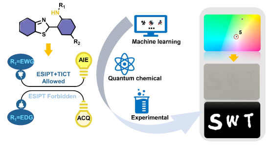 该研究巧妙通过人工智能建模分析得出分子内氢键的酸碱性与ESIPT类型之间的关系,然后通过量化计算与实验相结合的手段系统的研究了氨基型分子内氢键化合物的聚集诱导发光(AIE)和聚集导致淬灭(ACQ)的光学性质的差异的机制,并提出了基于激发态分子内质子转移(ESIPT)分子探针的聚集诱导发光的单分子白光成像材料的构建策略。