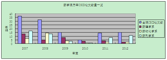 图4 药学院2007-2012年全院及分学科发表CSCD论文篇数比较