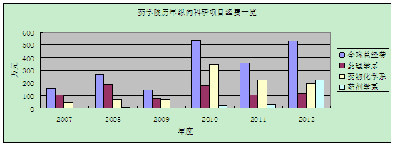 2007年至2012年,药学院共承担了863课题子项目1项、973课题子项目3项、“国家重大新药创制”重大专项5项、国家自然科学基金30余项,以及其他国家级和省部级科研项目80余项,进校的纵向科研项目逐渐向重大项目发展,尤其是近年来获得了多项“国家重大新药创制”,纵向科研课题已由追求数量逐渐转入追求质量阶段。进校的科研经费逐年稳步增长,6年累计进校纵向经费1900余万元;与企业合作项目100余项,累计进校横向经费2100余万元。