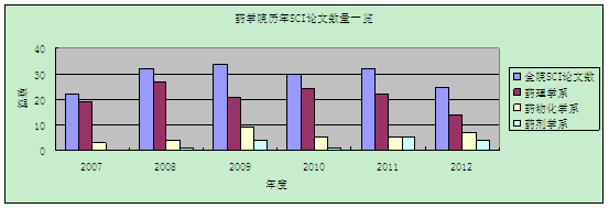 图3 药学院2007-2012年全院及分学科发表SCI论文篇数比较