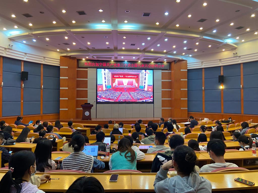 组织师生党员在福庆楼4楼学术报告厅集中收看党的二十大开幕式实况直播。在观看现场,师生边看边做好记录,不时响起热烈的掌声。观看结束后,师生党员以交流会、撰写心得等形式交流学习体会。