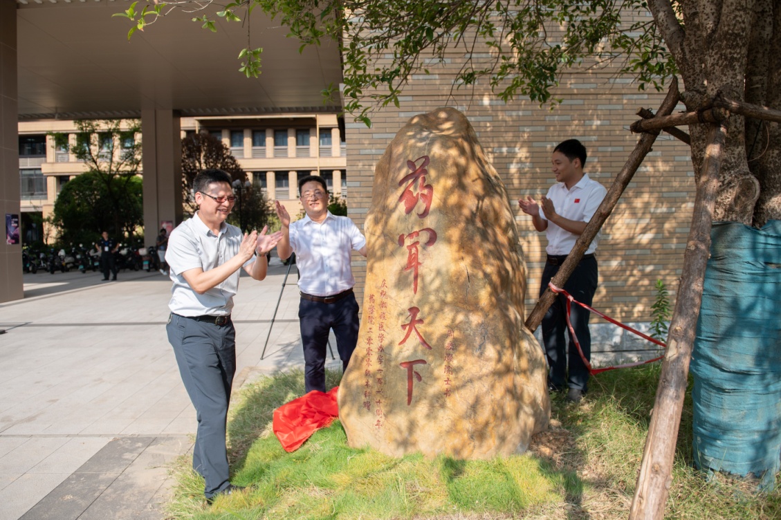 活动首先由2000级本科全体校友向学院捐赠景观石。由阳国平、曹东升、周文虎副院长以及2000级校友代表谭弘毅、曹伟共同为景观石揭幕,校友曹亚杰主持捐赠揭幕仪式。景观石上的“药闻天下”四个字是由周宏灏院士亲笔书写,寓意91成人