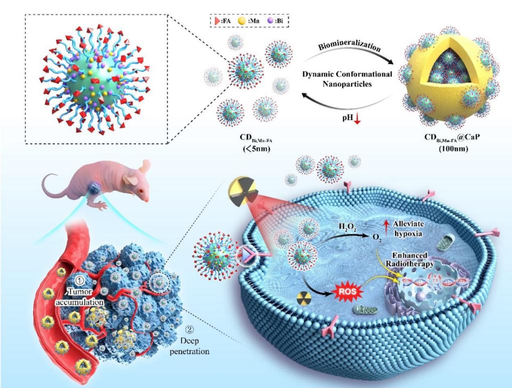 放射治疗是恶性肿瘤治疗的重要手段,但其疗效常受到肿瘤放射耐受性和微环境低氧等多重因素的限制。为了克服这些挑战,该团队创新性的推出了一种新型多功能放疗增敏剂——CDBi,Mn-FA@CaP,旨在提升放射治疗的靶向性与有效性,并克服传统治疗方法中的局限性。