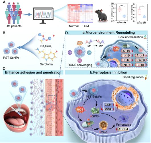 周文虎教授团队在生物材料领域国际顶尖期刊《Biomaterials》上发表了题为“Multifunctional selenium nanoplatforms for synergistic ferroptosis inhibition and immune microenvironment remodeling in oral mucositis”的最新研究成果。该研究创新性地揭示了铁死亡(Ferroptosis)是驱动口腔黏膜炎(OM)进展的核心病理机制,并开发了一种集“强效黏附、精准抗氧、免疫调控”于一体的聚血清素功能化硒纳米治疗平台(PST-SeNPs),为突破口腔黏膜修复瓶颈提供了新策略。
