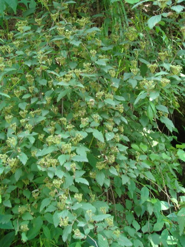 土庄绣线菊Spiraea pubescens Turcz. 蔷薇科绣线菊属。与麻叶绣线菊的区别:叶片菱状卵形至椭圆形,上面有疏柔毛,下面有灰色短柔毛,伞形花序有总梗。也为优良观赏灌木。