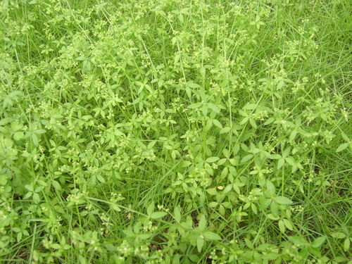 四叶葎Galium bungei Steud. 茜草科拉拉藤属。多年生草本,丛生,根红色。茎细弱,有四棱,无毛或稍有柔毛。叶4 片轮生,卵状长椭圆形,先端尖,上面及下面中脉疏生短刺毛。花小,十数朵成腋生或顶生的聚伞花序;花冠淡黄绿色。全草入药,有清热解毒,利尿,止血,消食之效。用于痢疾,尿路感染,小儿疳积,白带,咳血;外用治蛇头疔。